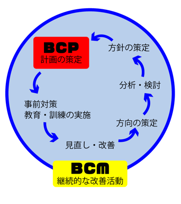 事業継続能力を維持・改善するためのプロセスをBCM(事業継続管理)、さらにサイクルを回すことをBCMS(事業継続管理運用)といいます。
